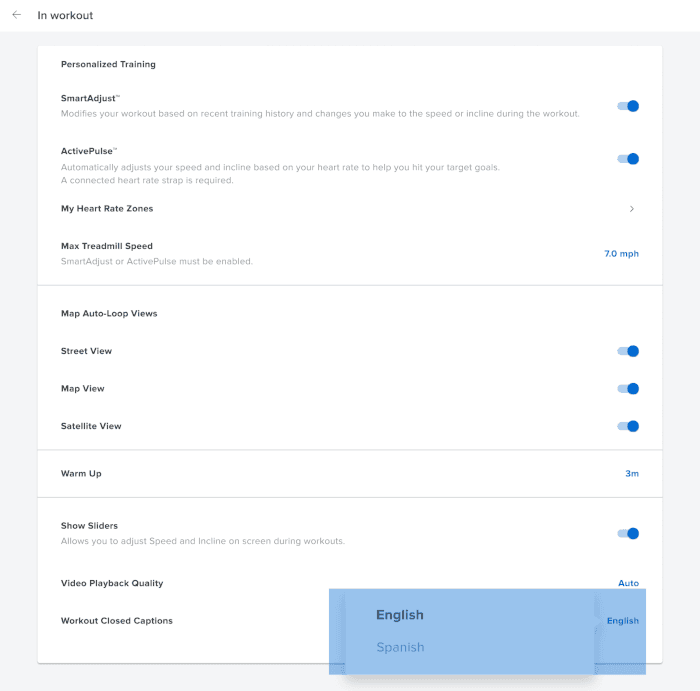 Navigate to your Settings, then tap on In Workout. At the bottom, under Workout Closed Captions, select your preferred language.