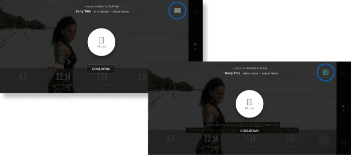 “What is a closed caption feature,” you ask? Closed captions (cc) are a text version of what is being said on the screen of what you’re watching. This iFIT feature was designed to give access to everyone, including those with different abilities, and compliment a user's audio experience while providing a visual explanation of what your iFIT trainer is instructing you to do, so you can enjoy an iFIT session in any workout environment.