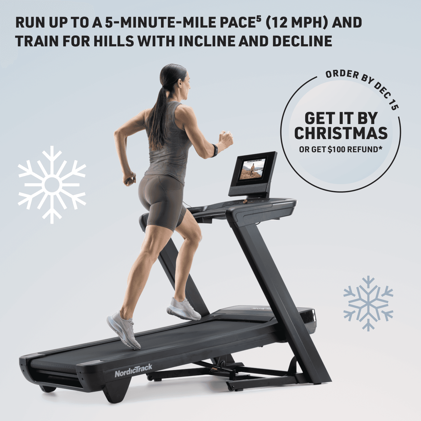 *“Get It Before Christmas” offer (“Offer”) valid on qualifying, in-stock purchases with in-home assembly through 12/13/2025 at 11:59 p.m. MST and standard delivery made through 12/15/2025 at 11:59 p.m. MST for residents in the Continental U.S., 18+. If the qualifying equipment purchased through the Offer is not received at the shipping address provided at the time of purchase in the Continental U.S. before December 24, 2025 at 11:59 p.m. MST (“Delivery Deadline”), the purchaser may receive a $100 refund on the purchase price for the qualifying equipment, subject to the following exceptions: the Offer will be void if (a) an attempted delivery or an offer by the carrier of a delivery appointment on or before the Delivery Deadline is made; or (b) unforeseen circumstances outside of NordicTrack’s reasonable control, including strikes, natural disasters, or severe weather, prevent NordicTrack from meeting the Delivery Deadline. The Offer is limited to non-PO addresses in the Continental U.S. To redeem the $100 refund, the purchaser must contact NordicTrack’s Customer Care team at 1-800-862-3348 by no later than 5 PM MST on December 31, 2025. After this time, the Offer will expire and purchasers will no longer be able to receive the $100 refund. Offer is not transferable or substitutable, not redeemable for cash or account credit, may not be combined with other offers, has no cash value, and will not be applied retroactively. Void where prohibited by law. iFIT reserves the right to end, revise, modify, or extend the Offer or its terms at any time without notice. NordicTrack shall not be responsible for any Offer errors, including tech errors. Please include your order number as part of the refund request and allow 8 to 12 weeks for processing.