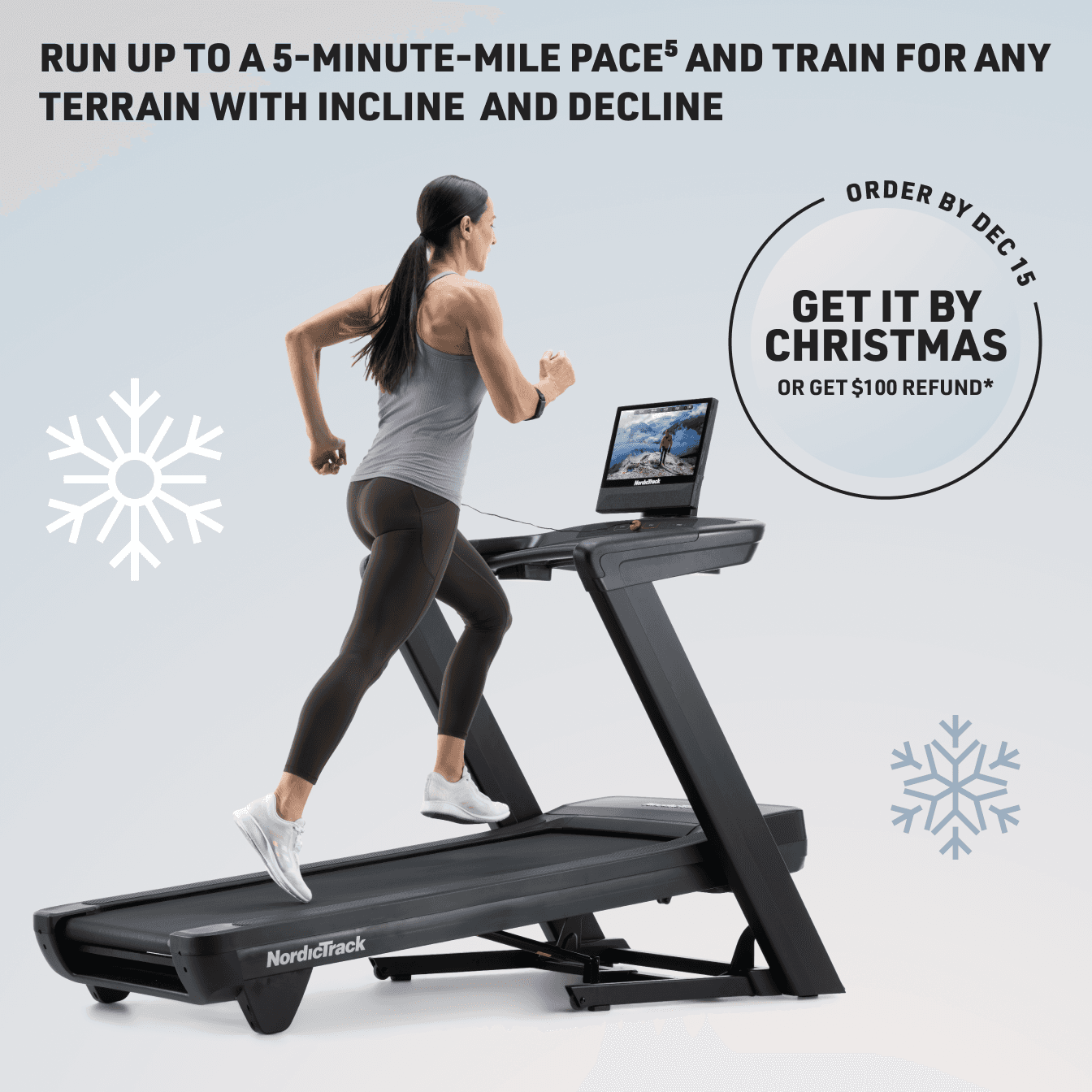 *“Get It Before Christmas” offer (“Offer”) valid on qualifying, in-stock purchases with in-home assembly through 12/13/2025 at 11:59 p.m. MST and standard delivery made through 12/15/2025 at 11:59 p.m. MST for residents in the Continental U.S., 18+. If the qualifying equipment purchased through the Offer is not received at the shipping address provided at the time of purchase in the Continental U.S. before December 24, 2025 at 11:59 p.m. MST (“Delivery Deadline”), the purchaser may receive a $100 refund on the purchase price for the qualifying equipment, subject to the following exceptions: the Offer will be void if (a) an attempted delivery or an offer by the carrier of a delivery appointment on or before the Delivery Deadline is made; or (b) unforeseen circumstances outside of NordicTrack’s reasonable control, including strikes, natural disasters, or severe weather, prevent NordicTrack from meeting the Delivery Deadline. The Offer is limited to non-PO addresses in the Continental U.S. To redeem the $100 refund, the purchaser must contact NordicTrack’s Customer Care team at 1-800-862-3348 by no later than 5 PM MST on December 31, 2025. After this time, the Offer will expire and purchasers will no longer be able to receive the $100 refund. Offer is not transferable or substitutable, not redeemable for cash or account credit, may not be combined with other offers, has no cash value, and will not be applied retroactively. Void where prohibited by law. iFIT reserves the right to end, revise, modify, or extend the Offer or its terms at any time without notice. NordicTrack shall not be responsible for any Offer errors, including tech errors. Please include your order number as part of the refund request and allow 8 to 12 weeks for processing.