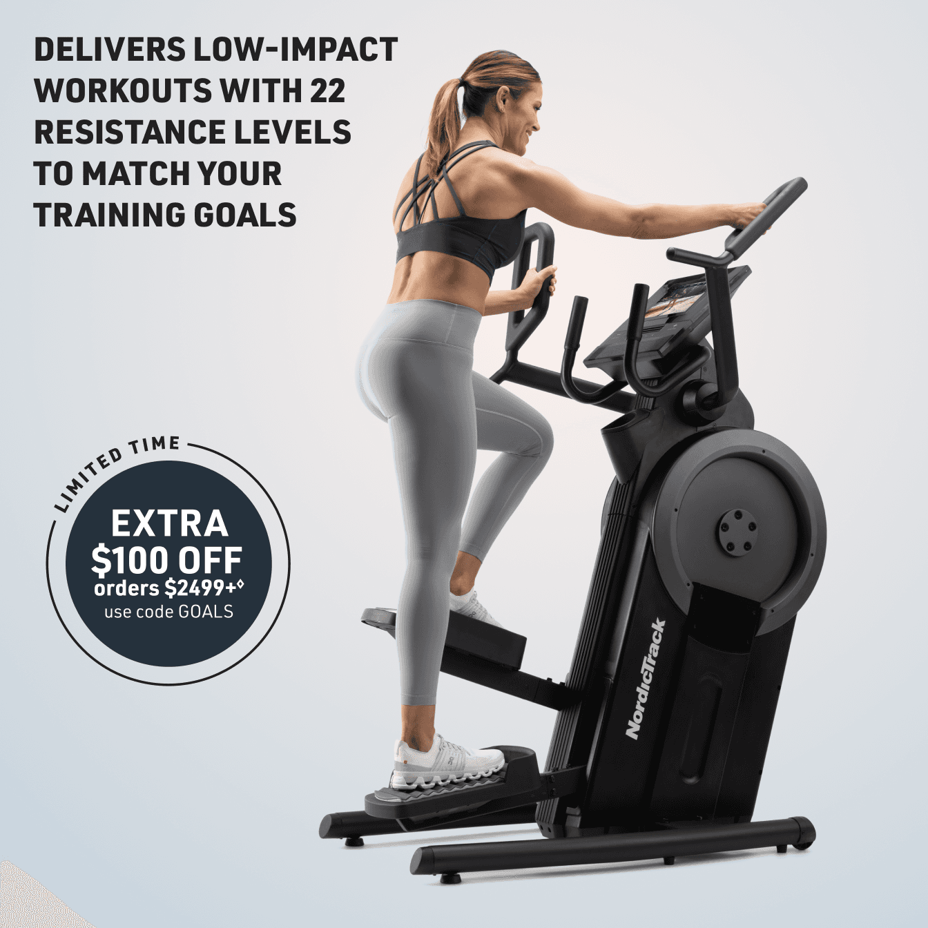 ◊Extra $100 off orders $2,499+ offer (“Offer”) available January 6, 2026 through January 8, 2026 until 11:59PM MST for U.S. residents, 18+. Discount only applies to the subtotal of order at Home and Exercise Equipment by NordicTrack - Treadmills, Ellipticals, and More and will not apply to taxes or shipping or other charges. Offer is not transferable, substitutable, not redeemable for cash or account credit, has no cash value, and will not be applied retroactively. Void where prohibited. Must enter GOALS promo code at checkout to obtain discount. Limit one per customer. Offer excludes Ultra Series products. NordicTrack reserves the right to end, revise, modify, or extend this Offer or its terms at any time without notice. NordicTrack is not responsible for any Offer errors, including tech errors