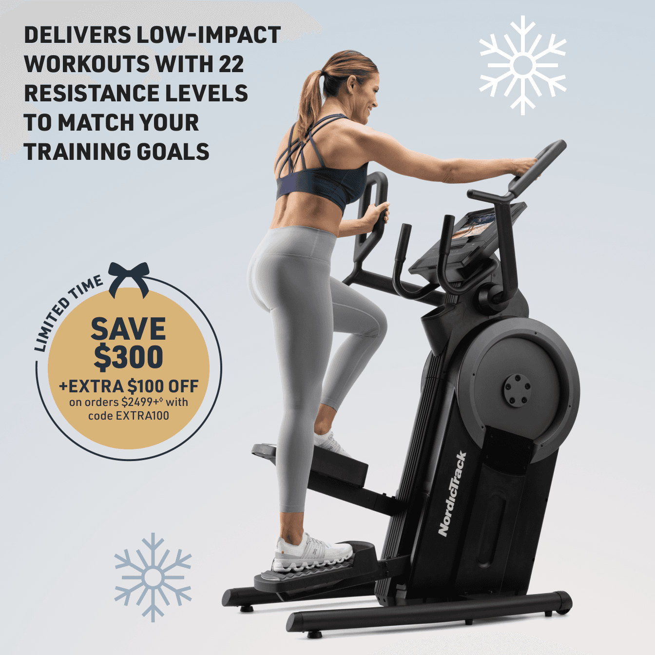 ◊Extra $100 off orders $2,499+ offer (“Offer”) available December 23, 2025 through December 25, 2025 until 11:59PM MST for U.S. residents, 18+. Discount only applies to the subtotal of order at Home and Exercise Equipment by NordicTrack - Treadmills, Ellipticals, and More and will not apply to taxes or shipping or other charges. Offer is not transferable, substitutable, not redeemable for cash or account credit, has no cash value, and will not be applied retroactively. Void where prohibited. Must enter EXTRA100 promo code at checkout to obtain discount. Limit one per customer. Offer excludes Ultra Series products. NordicTrack reserves the right to end, revise, modify, or extend this Offer or its terms at any time without notice. NordicTrack is not responsible for any Offer errors, including tech errors.