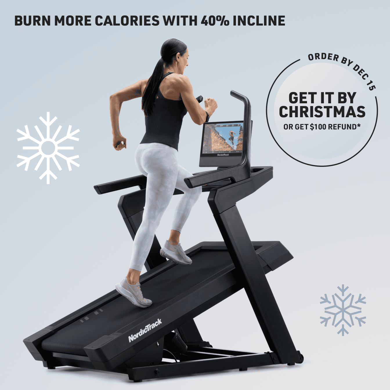 *“Get It Before Christmas” offer (“Offer”) valid on qualifying, in-stock purchases with in-home assembly through 12/13/2025 at 11:59 p.m. MST and standard delivery made through 12/15/2025 at 11:59 p.m. MST for residents in the Continental U.S., 18+. If the qualifying equipment purchased through the Offer is not received at the shipping address provided at the time of purchase in the Continental U.S. before December 24, 2025 at 11:59 p.m. MST (“Delivery Deadline”), the purchaser may receive a $100 refund on the purchase price for the qualifying equipment, subject to the following exceptions: the Offer will be void if (a) an attempted delivery or an offer by the carrier of a delivery appointment on or before the Delivery Deadline is made; or (b) unforeseen circumstances outside of NordicTrack’s reasonable control, including strikes, natural disasters, or severe weather, prevent NordicTrack from meeting the Delivery Deadline. The Offer is limited to non-PO addresses in the Continental U.S. To redeem the $100 refund, the purchaser must contact NordicTrack’s Customer Care team at 1-800-862-3348 by no later than 5 PM MST on December 31, 2025. After this time, the Offer will expire and purchasers will no longer be able to receive the $100 refund. Offer is not transferable or substitutable, not redeemable for cash or account credit, may not be combined with other offers, has no cash value, and will not be applied retroactively. Void where prohibited by law. iFIT reserves the right to end, revise, modify, or extend the Offer or its terms at any time without notice. NordicTrack shall not be responsible for any Offer errors, including tech errors. Please include your order number as part of the refund request and allow 8 to 12 weeks for processing.