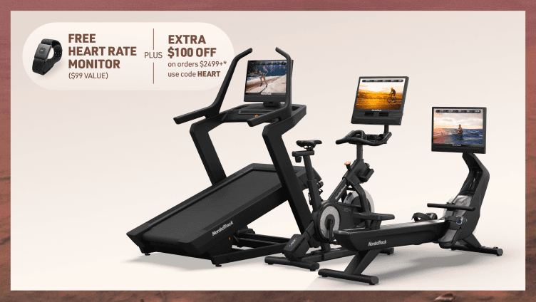 *Gift of Heart Rate Monitor with purchase offer (“Offer”) valid for U.S. residents, 18+ with the purchase of NEW NordicTrack equipment. Only valid while supplies last, on a first come, first served basis. Retail value of free item $99.99. Limit: one (1) free item per order. Offer is not transferable or substitutable, not redeemable for cash or account credit, may not be combined with other offers, has no cash value, and will not be applied retroactively. Void where prohibited by law. Offer automatically applied to eligible purchases at checkout. NordicTrack reserves the right to end, revise, modify, or extend this Offer or its terms at any time without notice. NordicTrack shall not be responsible for any Offer errors, including tech errors. This offer excludes: NAMSDB20, HRMC1098, PFMC408022, TMAK213, IFAHR120.