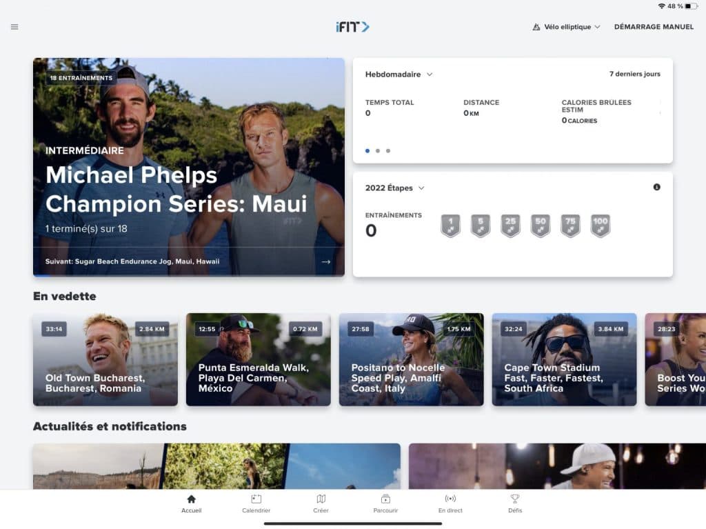 - Garmin Connect: take advantage of the performance statistics recorded on Garmin Connect by pairing the app with iFIT: number of steps, heart rate tracking, VO2 max, challenges, routes taken, etc.