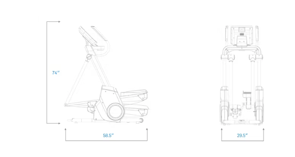 The X16 Elliptical Trainer has a footprint of 58.5" L (148.6 cm) x 29.5" W (74.9 cm) x 74" H (188 cm).